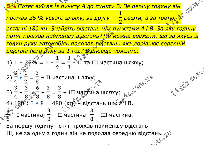 Потяг виїхав із пункту А до пункту В. За першу годину він проїхав 25 % усього шляху, за другу — 1/2 решти, а за третю — останні 180 км. Знайдіть відстань між пунктами А і В. За яку годину потяг проїхав найменшу відстань? Чи можна вважати, що за якусь із годин руху автомобіль подолав відстань, яка дорівнює середній відстані його руху за 1 год? Відповідь поясніть. 1) 1 – 25% = 1 – 1/4 = 3/4 – ІІ та ІІІ частина шляху; 2) 3/4 • 1/2 = 3/8 – ІІ частина шляху; 3) 3/4 – 3/8 = 6/8 – 3/8 = 3/8 – ІІІ частина шляху; 4) 180 : 3 • 8 = 480 (км) – відстань між А і В. 2/8 – І частина; 3/8 – ІІ частина; 3/8 – ІІІ частина. За першу годину потяг проїхав найменшу відстань. Ні, не за одну з годин він не подолав середню відстань.