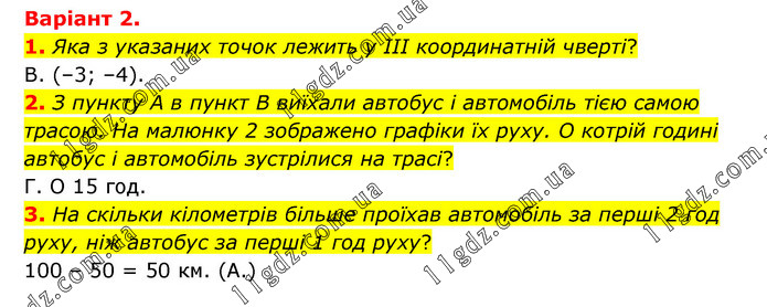 Варіант 2. 1. Яка з указаних точок лежить у III координатній чверті? В. (–3; –4). 2. З пункту А в пункт В виїхали автобус і автомобіль тією самою трасою. На малюнку 2 зображено графіки їх руху. O котрій годині автобус і автомобіль зустрілися на трасі? Г. О 15 год. 3. На скільки кілометрів більше проїхав автомобіль за перші 2 год руху, ніж автобус за перші 1 год руху? 100 – 50 = 50 км. (А.)