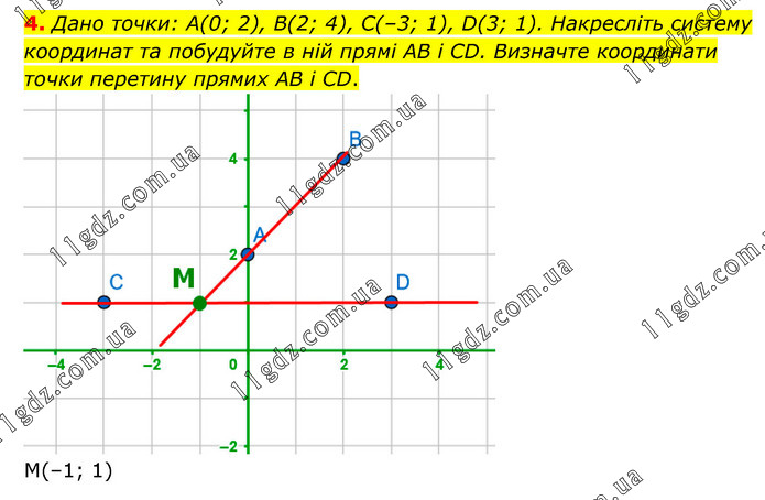 Дано точки: А(0; 2), В(2; 4), С(–3; 1), D(3; 1). Накресліть систему координат та побудуйте в ній прямі AB і CD. Визначте координати точки перетину прямих AB і CD. М(–1; 1)