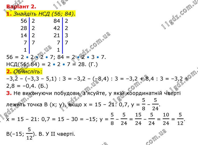 Варіант 2. 1. Знайдіть НСД (56; 84). 56 = 2 • 2 • 2 • 7; 84 = 2 • 2 • 3 • 7. НСД(56; 84) = 2 • 2 • 7 = 28. (Г.) 2. Обчисліть: –3,2 – (–3,3 – 5,1) : З = –3,2 – (–8,4) : 3 = –3,2 + 8,4 : 3 = –3,2 + 2,8 = –0,4. (Б.) 3. He виконуючи побудови, з’ясуйте, у якій координатній чверті лежить точка В (х; у), якщо х = 15 – 21: 0,7, у = 5/8 – 5/24. х = 15 – 21: 0,7 = 15 – 30 = –15; у = 5/8 – 5/24 = 15/24 – 5/24 = 10/24 = 5/12. В(–15; 5/12). В. У II чверті.