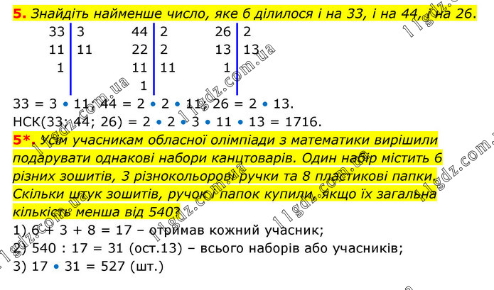 5. Знайдіть найменше число, яке б ділилося і на 33, і на 44, і на 26. 5*. Усім учасникам обласної олімпіади з математики вирішили подарувати однакові набори канцтоварів. Один набір містить 6 різних зошитів, 3 різнокольорові ручки та 8 пластикові папки. Скільки штук зошитів, ручок і папок купили, якщо їх загальна кількість менша від 540? 1) 6 + 3 + 8 = 17 – отримав кожний учасник; 2) 540 : 17 = 31 (ост.13) – всього наборів або учасників; 3) 17 • 31 = 527 (шт.)