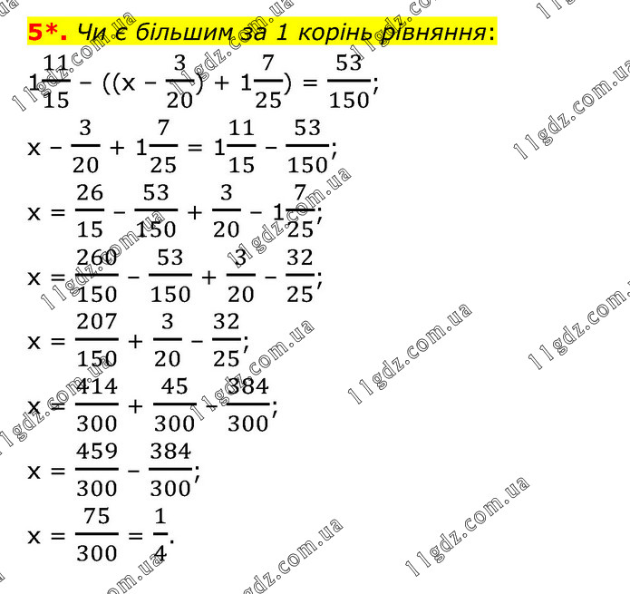 Чи є більшим за 1 корінь рівняння: 111/15 – ((х – 3/20) + 17/25) = 53/150; х – 3/20 + 17/25 = 111/15 – 53/150; х = 26/15 – 53/150 + 3/20 – 17/25; х = 260/150 – 53/150 + 3/20 – 32/25; х = 207/150 + 3/20 – 32/25; х = 414/300 + 45/300 – 384/300; х = 459/300 – 384/300; х = 75/300 = 1/4.