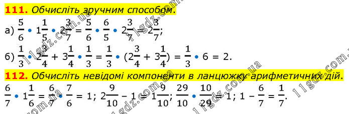 111. Обчисліть зручним способом. а) 5/6 • 11/5 • 23/7 = 5/6 • 6/5 • 23/7 = 23/7; б) 1/3 • 23/4 + 31/4 • 1/3 = 1/3 • (23/4 + 31/4) = 1/3 • 6 = 2. 112. Обчисліть невідомі компоненти в ланцюжку арифметичних дій. 6/7 • 11/6 = 6/7 • 7/6 = 1; 29/10 – 1 = 19/10; 29/10 • 10/29 = 1; 1 – 6/7 = 1/7.