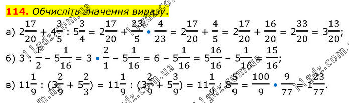 Обчисліть значення виразу. а) 217/20 + 43/5 : 53/4 = 217/20 + 23/5 • 4/23 = 217/20 + 4/5 = 217/20 + 16/20 = 233/20 = 313/20; б) 3 : 1/2 – 51/16 = 3 • 2/1 – 51/16 = 6 – 51/16 = 516/16 – 51/16 = 15/16; в) 111/9 : (32/9 + 52/3) = 111/9 : (32/9 + 53/9) = 111/9 : 85/9 = 100/9 • 9/77 = 123/77.