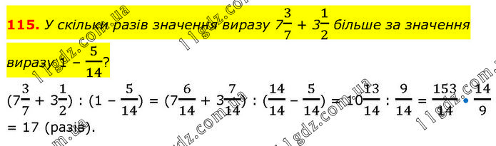 У скільки разів значення виразу 73/7 + 31/2 більше за значення виразу 1 – 5/14? (73/7 + 31/2) : (1 – 5/14) = (76/14 + 37/14) : (14/14 – 5/14) = 1013/14 : 9/14 = 153/14 • 14/9 = 17 (разів).