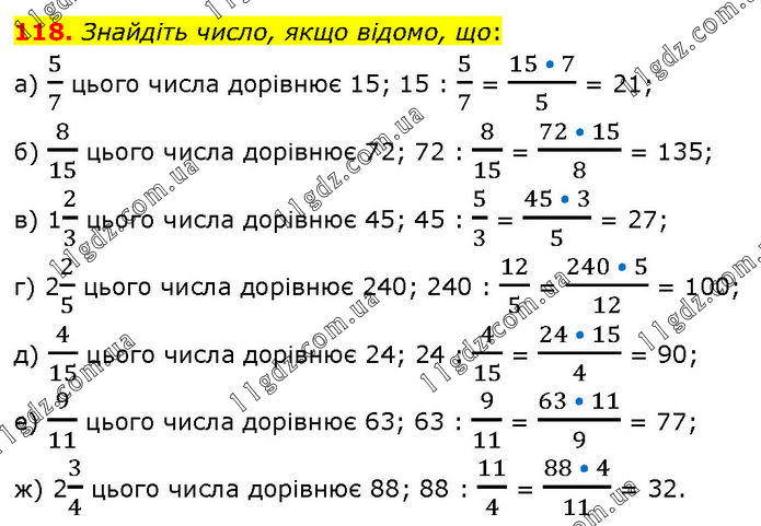 Знайдіть число, якщо відомо, що: а) 5/7 цього числа дорівнює 15; 15 : 5/7 = (15 • 7)/5 = 21; б) 8/15 цього числа дорівнює 72; 72 : 8/15 = (72 • 15)/8 = 135; в) 12/3 цього числа дорівнює 45; 45 : 5/3 = (45 • 3)/5 = 27; г) 22/5 цього числа дорівнює 240; 240 : 12/5 = (240 • 5)/12 = 100; д) 4/15 цього числа дорівнює 24; 24 : 4/15 = (24 • 15)/4 = 90; е) 9/11 цього числа дорівнює 63; 63 : 9/11 = (63 • 11)/9 = 77; ж) 23/4 цього числа дорівнює 88; 88 : 11/4 = (88 • 4)/11 = 32.