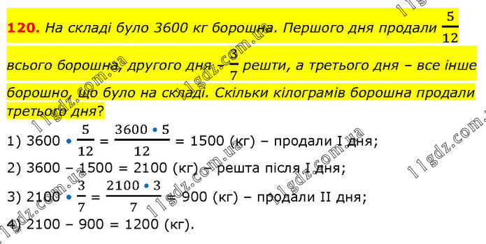На складі було 3600 кг борошна. Першого дня продали 5/12 всього борошна, другого дня – 3/7 решти, а третього дня – все інше борошно, що було на складі. Скільки кілограмів борошна продали третього дня? 1) 3600 • 5/12 = (3600 • 5)/12 = 1500 (кг) – продали І дня; 2) 3600 – 1500 = 2100 (кг) – решта після І дня; 3) 2100 • 3/7 = (2100 • 3)/7 = 900 (кг) – продали ІІ дня; 4) 2100 – 900 = 1200 (кг).
