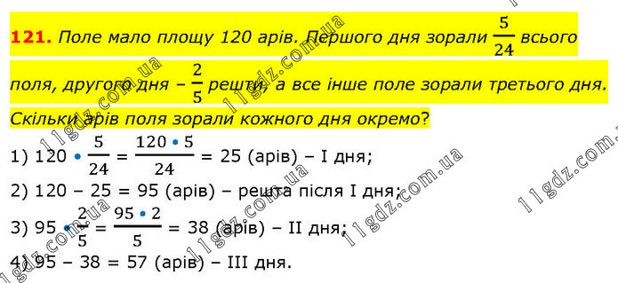 Поле мало площу 120 арів. Першого дня зорали 5/24 всього поля, другого дня – 2/5 решти, а все інше поле зорали третього дня. Скільки арів поля зорали кожного дня окремо? 1) 120 • 5/24 = (120 • 5)/24 = 25 (арів) – І дня; 2) 120 – 25 = 95 (арів) – решта після І дня; 3) 95 • 2/5 = (95 • 2)/5 = 38 (арів) – ІІ дня; 4) 95 – 38 = 57 (арів) – ІІІ дня.