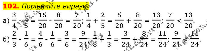 Порівняйте вирази. а) 3/4 - 2/5 = 15/20 - 8/20 = 7/20; 1/4 + 2/5 = 5/20 + 8/20 = 13/20; 7/20 < 13/20. б) 2/3 - 1/6 = 4/6 - 1/6 = 3/6 = 9/24; 1/8 + 1/3 = 3/24 + 8/24 = 11/24; 9/24 < 11/24.