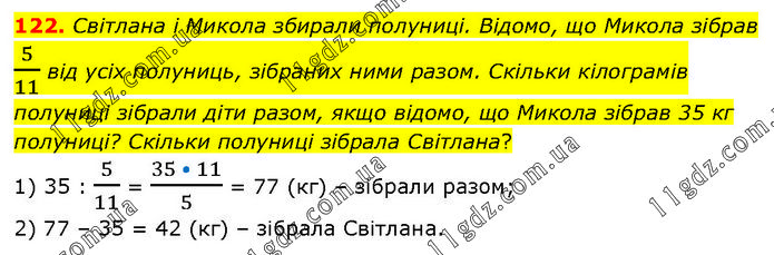 Світлана і Микола збирали полуниці. Відомо, що Микола зібрав 5/11 від усіх полуниць, зібраних ними разом. Скільки кілограмів полуниці зібрали діти разом, якщо відомо, що Микола зібрав 35 кг полуниці? Скільки полуниці зібрала Світлана? 1) 35 : 5/11 = (35 • 11)/5 = 77 (кг) – зібрали разом; 2) 77 – 35 = 42 (кг) – зібрала Світлана.