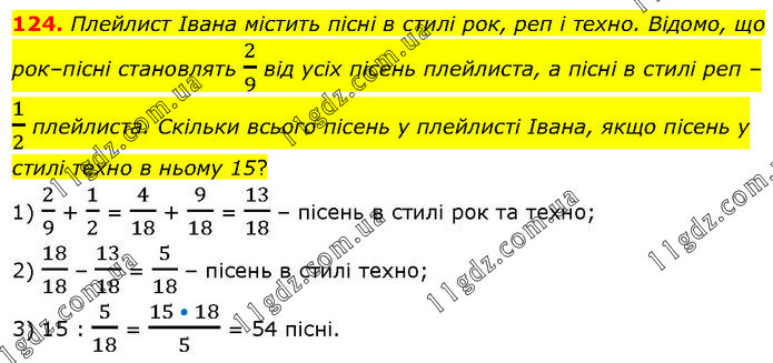 Плейлист Івана містить пісні в стилі рок, реп і техно. Відомо, що рок–пісні становлять 2/9 від усіх пісень плейлиста, а пісні в стилі реп – 1/2 плейлиста. Скільки всього пісень у плейлисті Івана, якщо пісень у стилі техно в ньому 15? 1) 2/9 + 1/2 = 4/18 + 9/18 = 13/18 – пісень в стилі рок та техно; 2) 18/18 – 13/18 = 5/18 – пісень в стилі техно; 3) 15 : 5/18 = (15 • 18)/5 = 54 пісні.