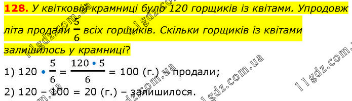 У квітковій крамниці було 120 горщиків із квітами. Упродовж літа продали 5/6 всіх горщиків. Скільки горщиків із квітами залишилось у крамниці? 1) 120 • 5/6 = (120 • 5)/6 = 100 (г.) – продали; 2) 120 – 100 = 20 (г.) – залишилося.