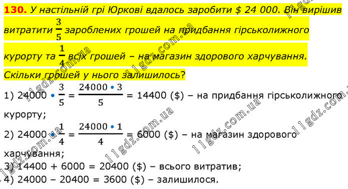У настільній грі Юркові вдалось заробити $ 24 000. Він вирішив витратити 3/5 зароблених грошей на придбання гірськолижного курорту та 1/4 всіх грошей – на магазин здорового харчування. Скільки грошей у нього залишилось? 1) 24000 • 3/5 = (24000 • 3)/5 = 14400 ($) – на придбання гірськолижного курорту; 2) 24000 • 1/4 = (24000 • 1)/4 = 6000 ($) – на магазин здорового харчування; 3) 14400 + 6000 = 20400 ($) – всього витратив; 4) 24000 – 20400 = 3600 ($) – залишилося.