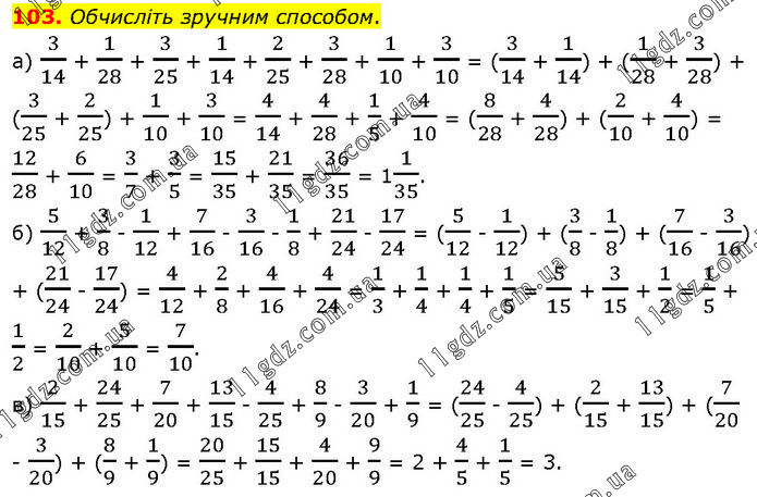 Обчисліть зручним способом. а) 3/14 + 1/28 + 3/25 + 1/14 + 2/25 + 3/28 + 1/10 + 3/10 = (3/14 + 1/14) + (1/28 + 3/28) + (3/25 + 2/25) + 1/10 + 3/10 = 4/14 + 4/28 + 1/5 + 4/10 = (8/28 + 4/28) + (2/10 + 4/10) = 12/28 + 6/10 = 3/7 + 3/5 = 15/35 + 21/35 = 36/35 = 11/35. б) 5/12 + 3/8 - 1/12 + 7/16 - 3/16 - 1/8 + 21/24 - 17/24 = (5/12 - 1/12) + (3/8 - 1/8) + (7/16 - 3/16) + (21/24 - 17/24) = 4/12 + 2/8 + 4/16 + 4/24 = 1/3 + 1/4 + 1/4 + 1/5 = 5/15 + 3/15 + 1/2 = 1/5 + 1/2 = 2/10 + 5/10 = 7/10. в) 2/15 + 24/25 + 7/20 + 13/15 - 4/25 + 8/9 - 3/20 + 1/9 = (24/25 - 4/25) + (2/15 + 13/15) + (7/20 - 3/20) + (8/9 + 1/9) = 20/25 + 15/15 + 4/20 + 9/9 = 2 + 4/5 + 1/5 = 3.