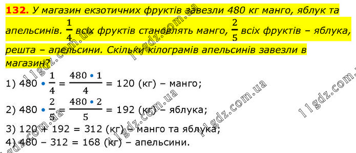 У магазин екзотичних фруктів завезли 480 кг манго, яблук та апельсинів. 1/4 всіх фруктів становлять манго, 2/5 всіх фруктів – яблука, решта – апельсини. Скільки кілограмів апельсинів завезли в магазин? 1) 480 • 1/4 = (480 • 1)/4 = 120 (кг) – манго; 2) 480 • 2/5 = (480 • 2)/5 = 192 (кг) – яблука; 3) 120 + 192 = 312 (кг) – манго та яблука; 4) 480 – 312 = 168 (кг) – апельсини.