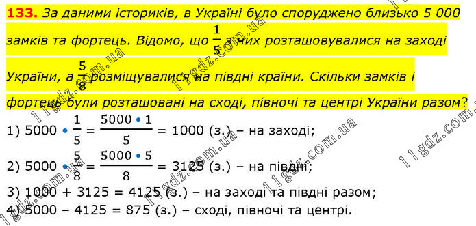 За даними істориків, в Україні було споруджено близько 5 000 замків та фортець. Відомо, що 1/5 з них розташовувалися на заході України, а 5/8 розміщувалися на півдні країни. Скільки замків і фортець були розташовані на сході, півночі та центрі України разом? 1) 5000 • 1/5 = (5000 • 1)/5 = 1000 (з.) – на заході; 2) 5000 • 5/8 = (5000 • 5)/8 = 3125 (з.) – на півдні; 3) 1000 + 3125 = 4125 (з.) – на заході та півдні разом; 4) 5000 – 4125 = 875 (з.) – сході, півночі та центрі.