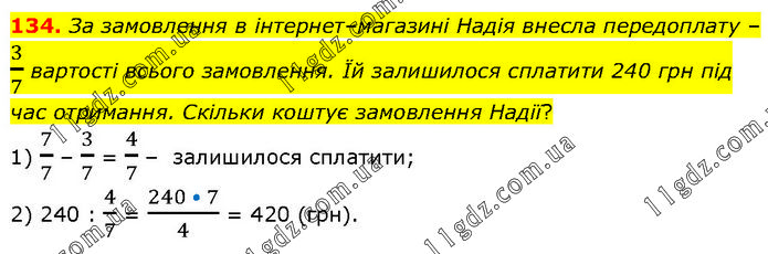 За замовлення в інтернет–магазині Надія внесла передоплату – 3/7 вартості всього замовлення. Їй залишилося сплатити 240 грн під час отримання. Скільки коштує замовлення Надії? 1) 7/7 – 3/7 = 4/7 – залишилося сплатити; 2) 240 : 4/7 = (240 • 7)/4 = 420 (грн).