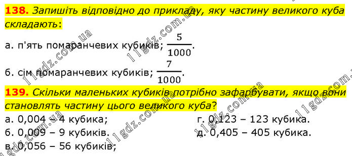 138. Запишіть відповідно до прикладу, яку частину великого куба складають: а. п'ять помаранчевих кубиків; 5/1000. б. сім помаранчевих кубиків; 7/1000. 139. Скільки маленьких кубиків потрібно зафарбувати, якщо вони становлять частину цього великого куба? а. 0,004 – 4 кубика; б. 0,009 – 9 кубиків. в. 0,056 – 56 кубиків; г. 0,123 – 123 кубика. д. 0,405 – 405 кубика.