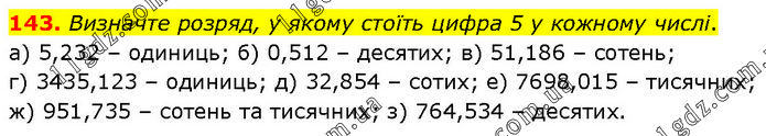 Визначте розряд, у якому стоїть цифра 5 у кожному числі. а) 5,232 – одиниць; б) 0,512 – десятих; в) 51,186 – сотень; г) 3435,123 – одиниць; д) 32,854 – сотих; е) 7698,015 – тисячних; ж) 951,735 – сотень та тисячних; з) 764,534 – десятих.