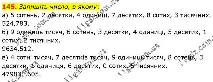 Запишіть число, в якому: а) 5 сотень, 2 десятки, 4 одиниці, 7 десятих, 8 сотих, 3 тисячних. 524,783. б) 9 одиниць тисяч, 6 сотень, 3 десятки, 4 одиниці, 5 десятих, 1 сотих, 2 тисячних. 9634,512. в) 4 сотні тисяч, 7 десятків тисяч, 9 одиниць тисяч, 8 сотень, 3 десятки, 1 одиниця, 6 десятих, 0 сотих, 5 тисячних. 479831,605.