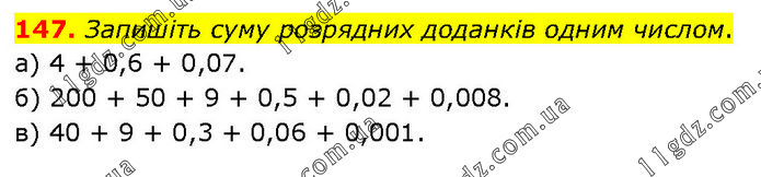 Запишіть суму розрядних доданків одним числом. а) 4 + 0,6 + 0,07. б) 200 + 50 + 9 + 0,5 + 0,02 + 0,008. в) 40 + 9 + 0,3 + 0,06 + 0,001.