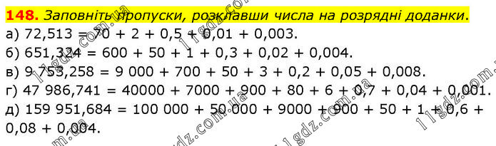 Заповніть пропуски, розклавши числа на розрядні доданки. а) 72,513 = 70 + 2 + 0,5 + 0,01 + 0,003. б) 651,324 = 600 + 50 + 1 + 0,3 + 0,02 + 0,004. в) 9 753,258 = 9 000 + 700 + 50 + 3 + 0,2 + 0,05 + 0,008. г) 47 986,741 = 40000 + 7000 + 900 + 80 + 6 + 0,7 + 0,04 + 0,001. д) 159 951,684 = 100 000 + 50 000 + 9000 + 900 + 50 + 1 + 0,6 + 0,08 + 0,004.