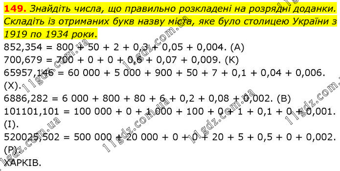 Знайдіть числа, що правильно розкладені на розрядні доданки. Складіть із отриманих букв назву міста, яке було столицею України з 1919 по 1934 роки. 852,354 = 800 + 50 + 2 + 0,3 + 0,05 + 0,004. (А) 700,679 = 700 + 0 + 0 + 0,6 + 0,07 + 0,009. (К) 65957,146 = 60 000 + 5 000 + 900 + 50 + 7 + 0,1 + 0,04 + 0,006. (Х). 6886,282 = 6 000 + 800 + 80 + 6 + 0,2 + 0,08 + 0,002. (В) 101101,101 = 100 000 + 0 + 1 000 + 100 + 0 + 1 + 0,1 + 0 + 0,001. (І). 520025,502 = 500 000 + 20 000 + 0 + 0 + 20 + 5 + 0,5 + 0 + 0,002. (Р). ХАРКІВ.