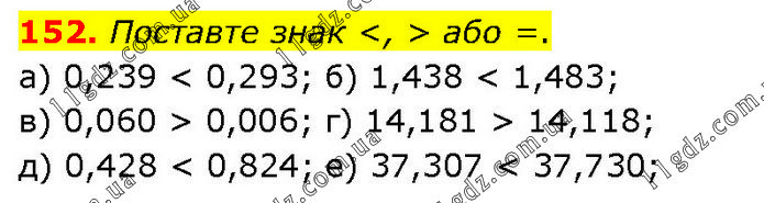 Поставте знак <, > або =. а) 0,239 < 0,293; б) 1,438 < 1,483; в) 0,060 > 0,006; г) 14,181 > 14,118; д) 0,428 < 0,824; е) 37,307 < 37,730;