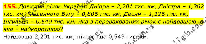 Довжина річок України: Дніпра – 2,201 тис. км, Дністра – 1,362 тис. км, Південного Бугу – 0,806 тис. км, Десни – 1,126 тис. км, Інгульця – 0,549 тис. км. Яка з перерахованих річок є найдовшою, а яка – найкоротшою? Найдовша 2,201 тис. км; нікоротша 0,549 тис. км.