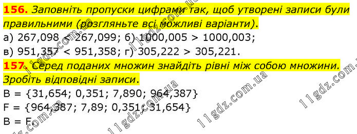 156. Заповніть пропуски цифрами так, щоб утворені записи були правильними (розгляньте всі можливі варіанти). а) 267,098 < 267,099; б) 1000,005 > 1000,003; в) 951,357 < 951,358; г) 305,222 > 305,221. 157. Серед поданих множин знайдіть рівні між собою множини. Зробіть відповідні записи. B = {31,654; 0,351; 7,890; 964,387} F = {964,387; 7,89; 0,351; 31,654} В = F.
