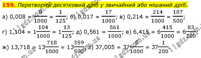 Перетворіть десятковий дріб у звичайний або мішаний дріб. а) 0,008 = 8/1000 = 1/125; б) 0,017 = 17/1000; в) 0,214 = 214/1000 = 107/500; г) 1,104 = 1104/1000 = 113/125; д) 0,561 = 561/1000; е) 6,415 = 6415/1000 = 683/200; ж) 13,718 = 13718/1000 = 13359/500; з) 37,005 = 375/1000 = 371/200.