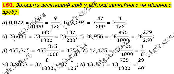 Запишіть десятковий дріб у вигляді звичайного чи мішаного дробу. а) 0,072 = 72/1000 = 9/125; б) 7,094 = 747/500 = 71/125; в) 23,685 = 23685/1000 = 23137/200; г) 38,956 = 38956/1000 = 38239/250; д) 435,875 = 435875/1000 = 4357/8; е) 12,125 = 12125/1000 = 1/8; ж) 37,008 = 378/1000 = 371/125; з) 13,725 = 13725/1000 = 29/40.