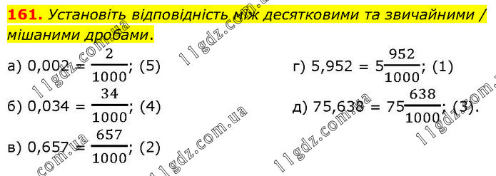 Установіть відповідність між десятковими та звичайними / мішаними дробами. а) 0,002 = 2/1000; (5) б) 0,034 = 34/1000; (4) в) 0,657 = 657/1000; (2) г) 5,952 = 5952/1000; (1) д) 75,638 = 75638/1000; (3).