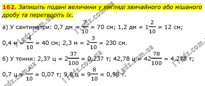 Запишіть подані величини у вигляді звичайного або мішаного дробу та перетворіть їх. а) У сантиметри: 0,7 дм = 7/10 = 70 см; 1,2 дм = 12/10 = 12 см; 0,4 м = 4/10 = 40 см; 2,3 м = 23/10 = 230 см. б) У тонни: 2,37 ц = 237/100 = 0,237 т; 42,78 ц = 4278/100 = 4,278 т; 0,7 ц = 7/10 = 0,07 т; 9,8 ц = 98/10 = 0,98 т.
