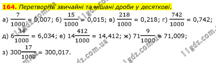 Перетворіть звичайні та мішані дроби у десяткові. а) 7/1000 = 0,007; б) 15/1000 = 0,015; в) 218/1000 = 0,218; г) 742/1000 = 0,742; д) 634/1000 = 6,034; е) 14412/1000 = 14,412; ж) 719/1000 = 71,009; з) 30017/1000 = 300,017.