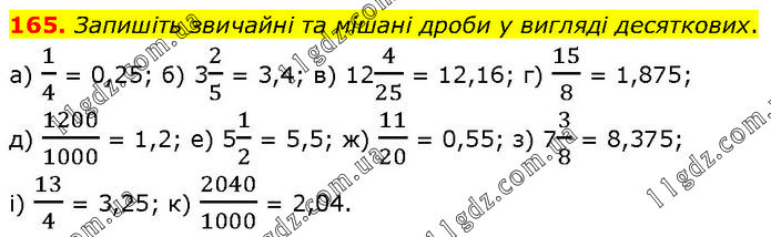 Запишіть звичайні та мішані дроби у вигляді десяткових. а) 1/4 = 0,25; б) 32/5 = 3,4; в) 124/25 = 12,16; г) 15/8 = 1,875; д) 1200/1000 = 1,2; е) 51/2 = 5,5; ж) 11/20 = 0,55; з) 73/8 = 8,375; і) 13/4 = 3,25; к) 2040/1000 = 2,04.