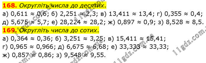 168. Округліть числа до десятих. а) 0,611 ≈ 0,6; б) 2,251 ≈ 2,3; в) 13,411 ≈ 13,4; г) 0,355 ≈ 0,4; д) 5,675 ≈ 5,7; е) 28,224 ≈ 28,2; ж) 0,897 ≈ 0,9; з) 8,528 ≈ 8,5. 169. Округліть числа до сотих. а) 0,364 ≈ 0,36; б) 3,251 ≈ 3,25; в) 15,411 ≈ 15,41; г) 0,965 ≈ 0,966; д) 6,675 ≈ 6,68; е) 33,333 ≈ 33,33; ж) 0,857 ≈ 0,86; з) 9,548 ≈ 9,55.