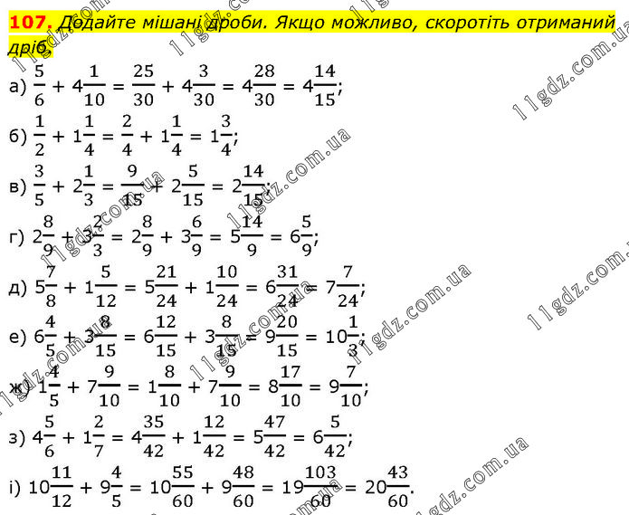 Додайте мішані дроби. Якщо можливо, скоротіть отриманий дріб. а) 5/6 + 41/10 = 25/30 + 43/30 = 428/30 = 414/15; б) 1/2 + 11/4 = 2/4 + 11/4 = 13/4; в) 3/5 + 21/3 = 9/15 + 25/15 = 214/15; г) 28/9 + 32/3 = 28/9 + 36/9 = 514/9 = 65/9; д) 57/8 + 15/12 = 521/24 + 110/24 = 631/24 = 77/24; е) 64/5 + 38/15 = 612/15 + 38/15 = 920/15 = 101/3; ж) 14/5 + 79/10 = 18/10 + 79/10 = 817/10 = 97/10; з) 45/6 + 12/7 = 435/42 + 112/42 = 547/42 = 65/42; і) 1011/12 + 94/5 = 1055/60 + 948/60 = 19103/60 = 2043/60.