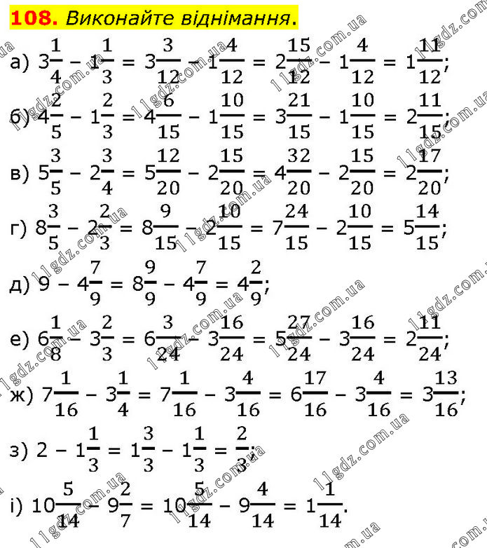 Виконайте віднімання. а) 31/4 – 11/3 = 33/12 – 14/12 = 215/12 – 14/12 = 111/12; б) 42/5 – 12/3 = 46/15 – 110/15 = 321/15 – 110/15 = 211/15; в) 53/5 – 23/4 = 512/20 – 215/20 = 432/20 – 215/20 = 217/20; г) 83/5 – 22/3 = 89/15 – 210/15 = 724/15 – 210/15 = 514/15; д) 9 – 47/9 = 89/9 – 47/9 = 42/9; е) 61/8 – 32/3 = 63/24 – 316/24 = 527/24 – 316/24 = 211/24; ж) 71/16 – 31/4 = 71/16 – 34/16 = 617/16 – 34/16 = 313/16; з) 2 – 11/3 = 13/3 – 11/3 = 2/3; і) 105/14 – 92/7 = 105/14 – 94/14 = 11/14.