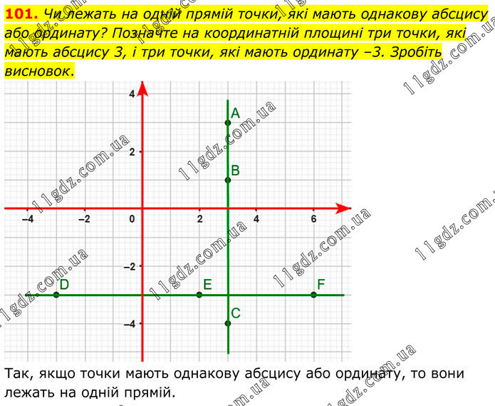 Чи лежать на одній прямій точки, які мають однакову абсцису або ординату? Позначте на координатній площині три точки, які мають абсцису 3, і три точки, які мають ординату –3. Зробіть висновок. Так, якщо точки мають однакову абсцису або ординату, то вони лежать на одній прямій.