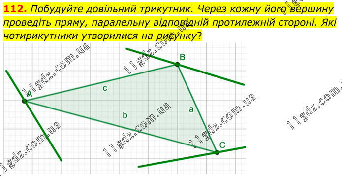 Побудуйте довільний трикутник. Через кожну його вершину проведіть пряму, паралельну відповідній протилежній стороні. Які чотирикутники утворилися на рисунку?