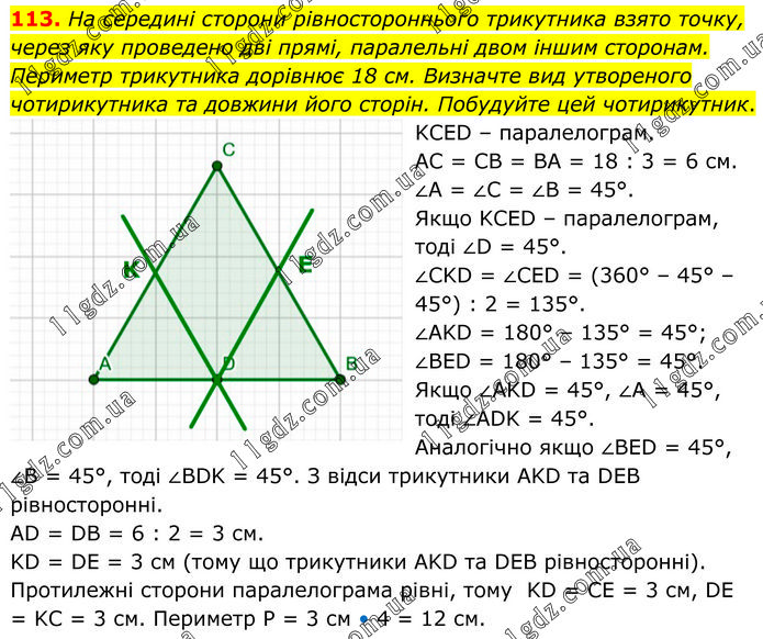 На середині сторони рівностороннього трикутника взято точку, через яку проведено дві прямі, паралельні двом іншим сторонам. Периметр трикутника дорівнює 18 см. Визначте вид утвореного чотирикутника та довжини його сторін. Побудуйте цей чотирикутник. KCED – паралелограм. АС = СВ = ВА = 18 : 3 = 6 см. ∠А = ∠С = ∠В = 45°. Якщо KCED – паралелограм, тоді ∠D = 45°. ∠CKD = ∠CED = (360° – 45° – 45°) : 2 = 135°. ∠AKD = 180° – 135° = 45°; ∠BED = 180° – 135° = 45°. Якщо ∠AKD = 45°, ∠А = 45°, тоді ∠ADK = 45°. Аналогічно якщо ∠BED = 45°, ∠В = 45°, тоді ∠ВDK = 45°. З відси трикутники AKD та DEB рівносторонні. AD = DB = 6 : 2 = 3 см. KD = DE = 3 см (тому що трикутники AKD та DEB рівносторонні). Протилежні сторони паралелограма рівні, тому KD = СE = 3 см, DE = KC = 3 см. Периметр Р = 3 см • 4 = 12 см.