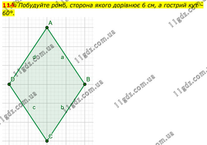 Побудуйте ромб, сторона якого дорівнює 6 см, а гострий кут – 60°.