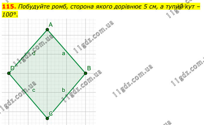 Побудуйте ромб, сторона якого дорівнює 5 см, а тупий кут – 100°.