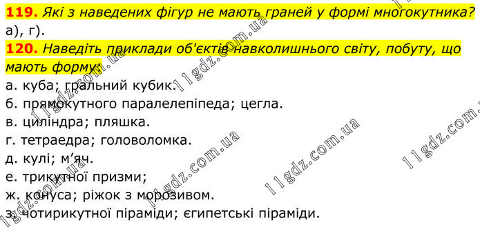 119. Які з наведених фігур не мають граней у формі многокутника? а), г). 120. Наведіть приклади об'єктів навколишнього світу, побуту, що мають форму: а. куба; гральний кубик. б. прямокутного паралелепіпеда; цегла. в. циліндра; пляшка. г. тетраедра; головоломка. д. кулі; м’яч. е. трикутної призми; ж. конуса; ріжок з морозивом. з. чотирикутної піраміди; єгипетські піраміди.