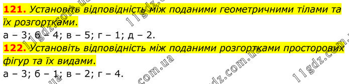 121. Установіть відповідність між поданими геометричними тілами та їх розгортками. а – 3; б – 4; в – 5; г – 1; д – 2. 122. Установіть відповідність між поданими розгортками просторових фігур та їх видами. а – 3; б – 1; в – 2; г – 4.
