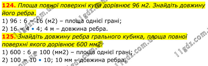 124. Площа повної поверхні куба дорівнює 96 м2. Знайдіть довжину його ребра. 1) 96 : 6 = 16 (м2) – площа однієї грані; 2) 16 = 4 • 4; 4 м – довжина ребра. 125. Знайдіть довжину ребра грального кубика, площа повної поверхні якого дорівнює 600 мм2. 1) 600 : 6 = 100 (мм2) – площа однієї грані; 2) 100 = 10 • 10; 10 мм – довжина ребра.