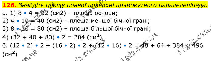 Знайдіть площу повної поверхні прямокутного паралелепіпеда. а. 1) 8 • 4 = 32 (см2) – площа основи; 2) 4 • 10 = 40 (см2) – площа меншої бічної грані; 3) 8 • 10 = 80 (см2) – площа більшої бічної грані; 4) (32 + 40 + 80) • 2 = 304 (см2) б. (12 • 2) • 2 + (16 • 2) • 2 + (12 • 16) • 2 = 48 + 64 + 384 = 496 (см2)