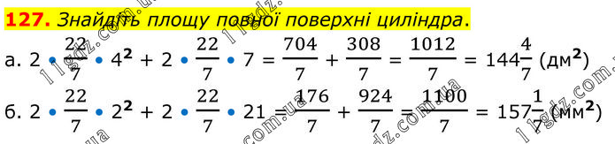 Знайдіть площу повної поверхні циліндра. а. 2 • 22/7 • 42 + 2 • 22/7 • 7 = 704/7 + 308/7 = 1012/7 = 1444/7 (дм2) б. 2 • 22/7 • 22 + 2 • 22/7 • 21 = 176/7 + 924/7 = 1100/7 = 1571/7 (мм2)
