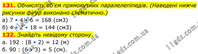 131. Обчисліть об'єм прямокутних паралелепіпедів. (Наведені нижче рисунки фігур виконано схематично.) а) 7 • 4 • 6 = 168 (см3) б) 4 • 2 • 18 = 144 (см3) 132. Знайдіть невідому сторону. а. 192 : (8 • 2) = 12 (м) б. 90 : (6 • 3) = 5 (см).